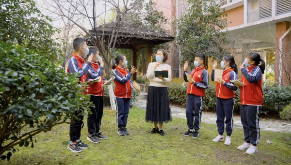 “碧玉妆成一树高,万条垂下绿丝绦。不知细叶谁裁出,二月春风似剪刀。”在明德苑中,经典诵读班的孩子们身着汉服,围坐在蒲团上,在刘莹老师指导下开展“咏”绿经典诵读活动。师生们在暖阳下舒展身姿,春风拂过,抖落一身旖旎。五年级古筝班的孩子用古筝为大家弹奏出动人的旋律《春去春又来》,小伙伴们被琴声吸引,有的不由自主地跳出流畅的舞步,有的摆起画架拿起画本……