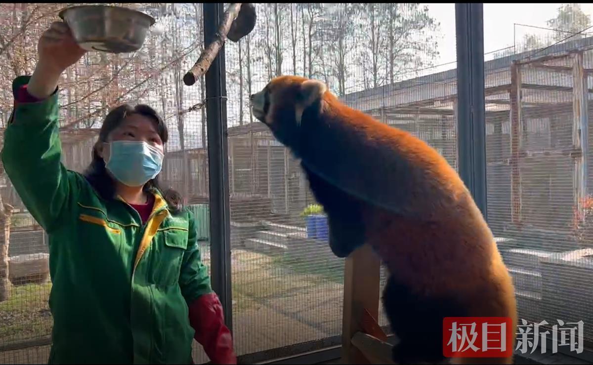 食物诱惑,饲养员故意让小熊猫多运动