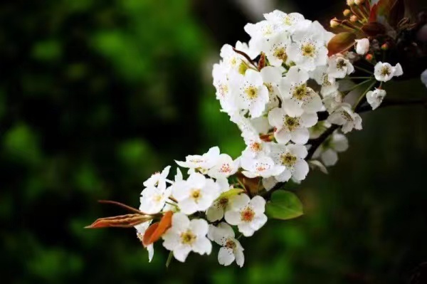 梨花是一簇簇开放在绿叶之间的,花蕊颜色深,并且略带红色,当它快凋谢时会变成胭脂红,梨花的花瓣没有开口。梨花的花期是3月,大家赏梨花可要抓紧时间了。