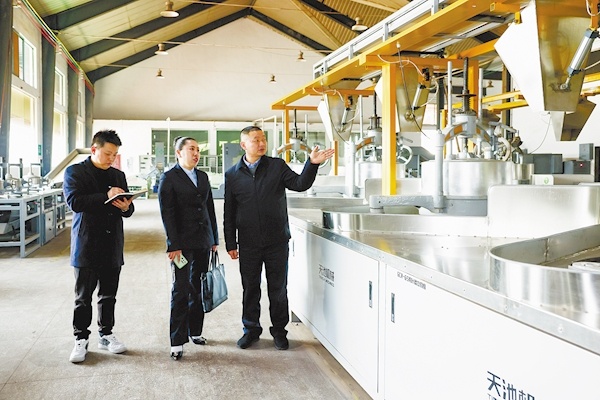 3月11日,在宣恩县伍台昌臣茶业有限公司,邮储银行工作人员了解企业融资需求。 (湖北日报全媒记者 蔡俊 通讯员 陈绪开 摄)