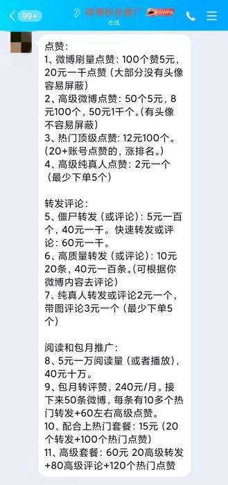 其实“星援”并不是个例,只要你在微博上搜索“买转发”,就会出现一大波提供类似服务的商家。记者添加了某位商家后,拿到一份明码标价的价目表。其中显示,转发、点赞、评论等数据都可用钱“水出来”,并且交易过程没有任何的保障。