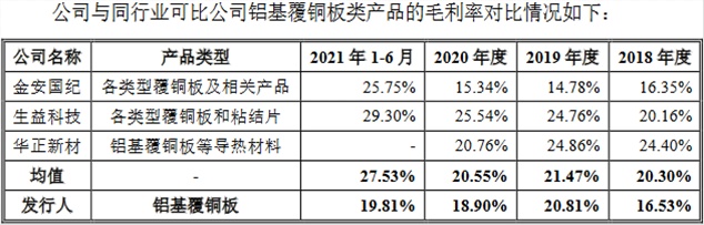 报告期内,同行业可比公司铜箔类产品的毛利率平均值分别为20.50%、18.97%、17.34%和25.84%,同行业可比公司铝基覆铜板类产品的毛利率平均值分别为20.30%、21.47%、20.55%和27.53%。