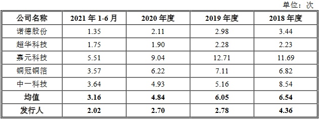 报告期各期,逸豪新材应收账款周转率分别为4.36次、2.78次、2.70次和2.02次,同行业可比公司应收账款周转率平均值分别为6.54次、6.05次、4.84次和3.16次。