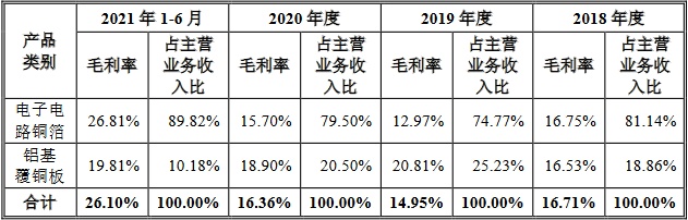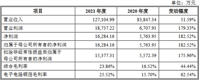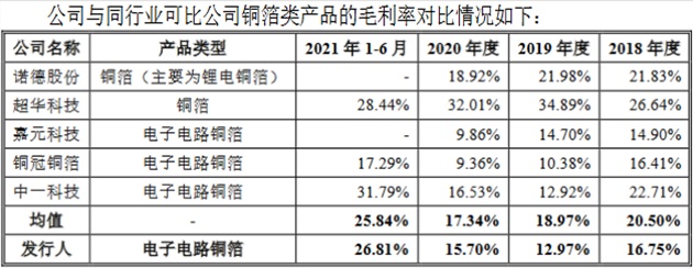另据招股说明书,2021年,逸豪新材综合毛利率为23.86%,电子电路铜箔毛利率为25.52%。