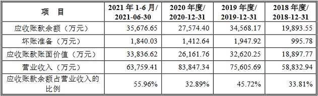 报告期各期末,逸豪新材应收账款账面价值分别为1.89亿元、3.26亿元、2.62亿元和3.38亿元,占流动资产的比例分别为40.76%、54.38%、39.63%和46.70%;坏账准备分别为995.78万元、1947.92万元、1412.64万元和1840.03万元;应收账款余额分别为1.99亿元、3.46亿元、2.76亿元和3.57亿元,占营业收入的比例分别为33.81%、45.72%、32.89%和55.96%。