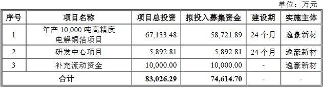 逸豪新材本次拟公开发行不超过4226.6667万股(不考虑超额配售选择权),不低于本次公开发行后公司总股本的25.00%。该公司拟募集资金7.46亿元,其中,5.87亿元拟用于年产10000吨高精度电解铜箔项目,5892.81万元拟用于研发中心项目,1.00亿元拟用于补充流动资金。