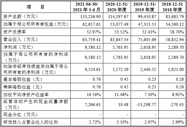 2018年、2019年、2020年和2021年1-6月,逸豪新材实现营业收入分别为5.88亿元、7.56亿元、8.38亿元和6.38亿元,实现归属于母公司所有者的净利润分别为2289.70万元、2618.95万元、5763.95万元和9580.12万元,实现扣除非经常性损益后归属于母公司所有者的净利润分别为1821.00万元、2440.52万元、5572.39万元和9524.61万元。