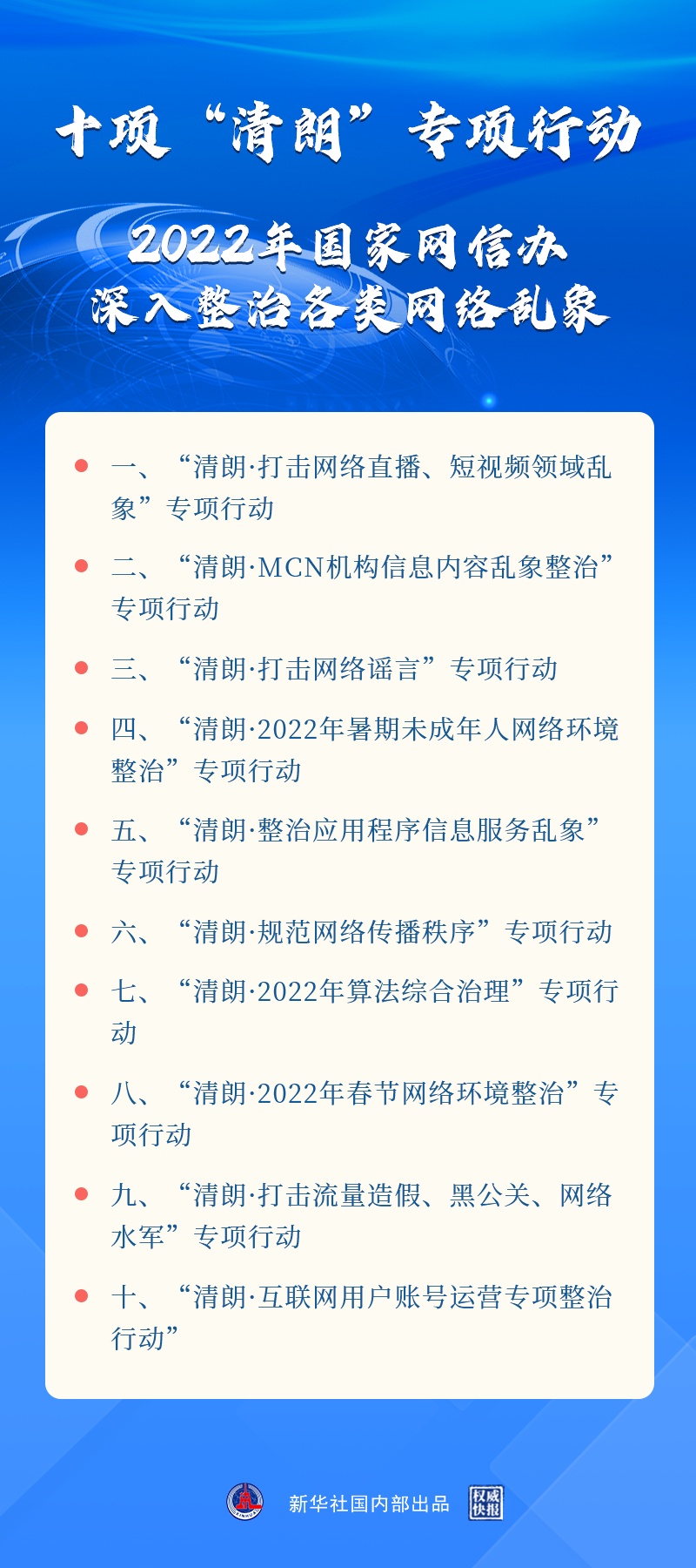 国家网信办部署开展2022年“清朗”系列专项行动,聚焦影响面广、危害性大的问题开展整治,具体包括10个方面重点任务: