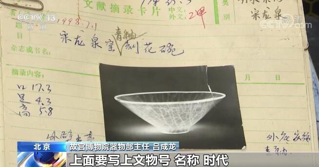 故宫博物院器物部主任 吕成龙:那个时候没有电脑,我们积累学术资料就是靠做卡片,文献摘录卡片。那时候还是黑白照片拍的,上面要写上文物号、名称、时代、尺寸等这些信息,我现在还留下来有上万张卡片。