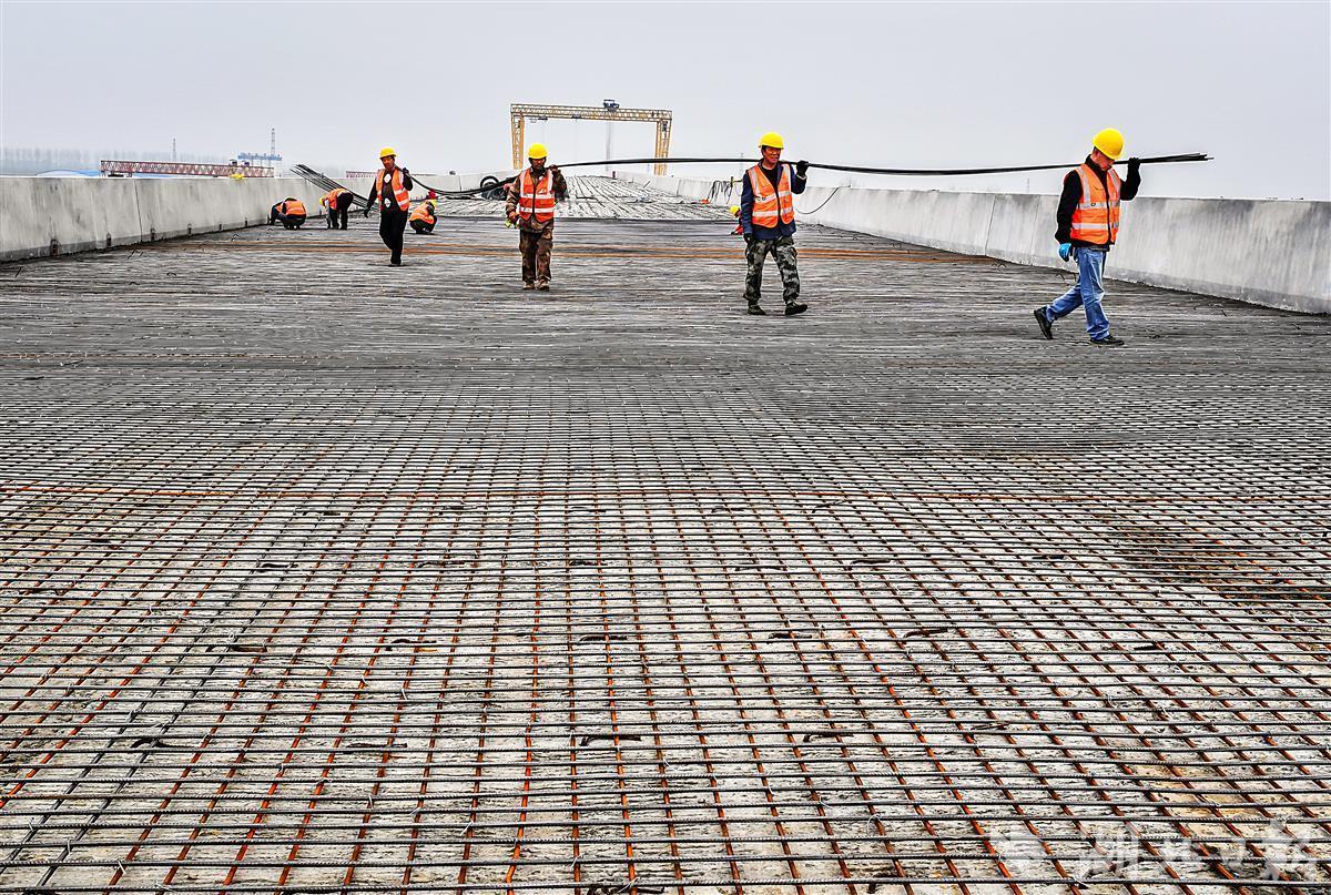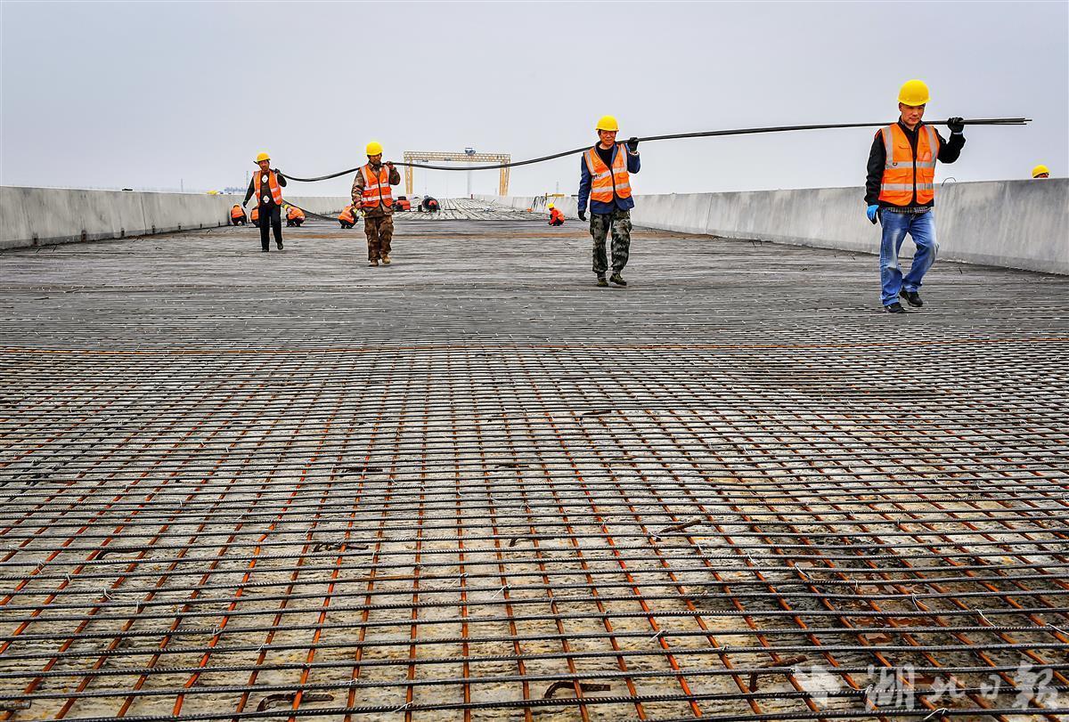 3月18日,G347武汉新洲段改建工程项目现场热火朝天,工人正在高架桥上铺钢筋和现浇混凝土。据施工方中铁十七局项目书记张天龙介绍,现在整个项目的桩基、墩柱等下部结构已经全部完成,桥梁生产及架设已经完成70%,力争今年9月底全线通车。