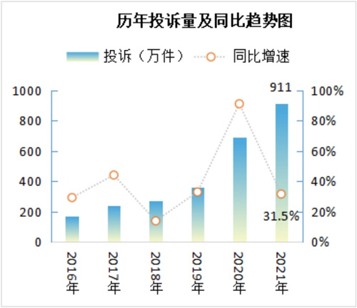 市场监管总局发布数据显示,2021年投诉量有所上升,全国市场监管部门共受理消费者投诉911万件,同比增长31.5%。