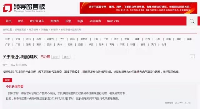 收到琚女士留言后,长垣市委办公室积极回应,称网友反映的问题已责成市住建局进行处理,相关回复如下:目前,我市城区集中供热时限已延长至2022年3月22日零时,延长供暖期间不再另行收取采暖费用。