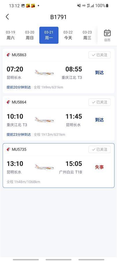 3月21日,周一,按照以往的飞行惯例,它将在昆明与重庆、广州、成都之间飞行5次,这应当是它最忙碌的一天。
