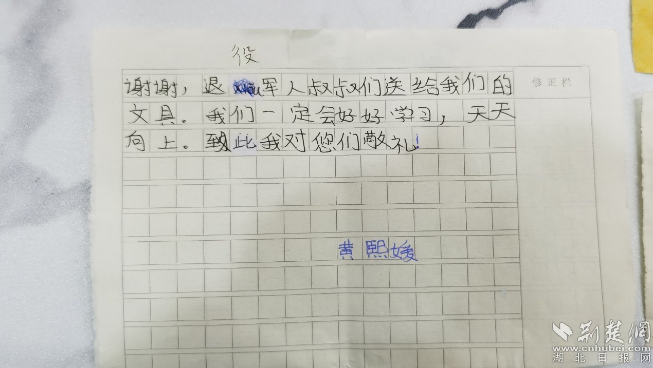 荆楚网(湖北日报网)讯(通讯员程国辉、张文)“谢谢退役军人叔叔们送来的文具,我们一定好好学习,天天向上!”。3月22日,应城市退役军人事务局工作人员收到了来自该市陈河镇中心小学黄熙媛、丁博洋等11名同学寄来的感谢信。
