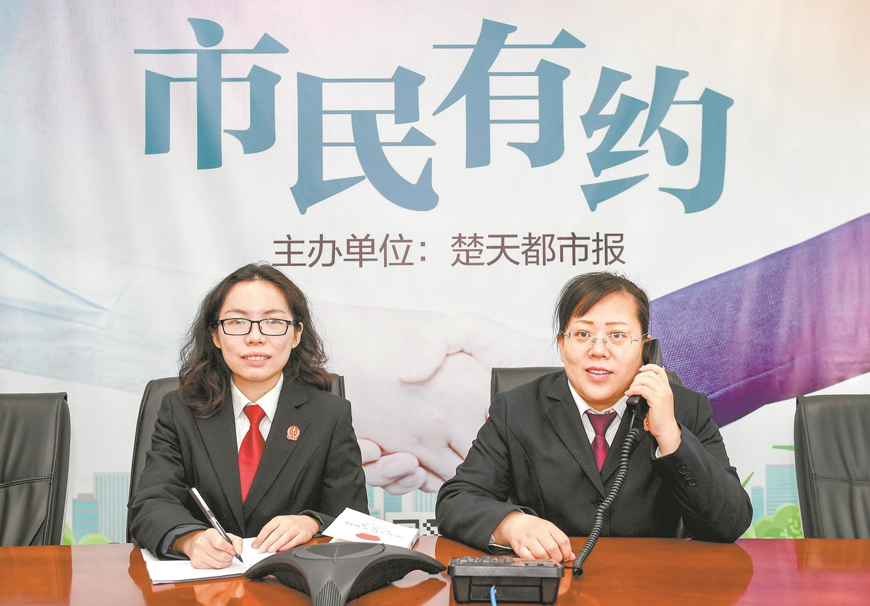东湖高新区法院民庭副庭长蔡丽红(右)、法官刘燕双接听热线