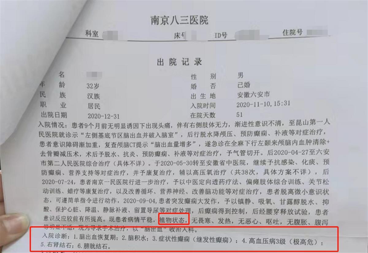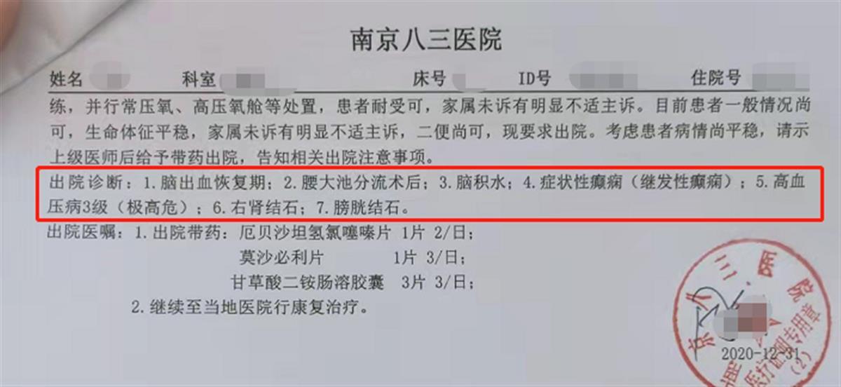 极目新闻记者从刘女士提供的南京八三医院2020年12月31日开具的出院记录上看到,入院时她丈夫处于植物人状态,为寻求手术治疗,以“脑出血”收治入科。出院时处于脑出血恢复期,存在脑积水、症状性癫痫、高血压3级(极高危)等多种病症。