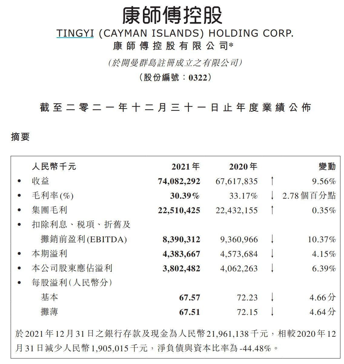 3月28日晚间,康师傅控股有限公司(0322.HK,康师傅控股)公告称,2021年归属于上市公司股东的净利润(归母净利润)38.02亿元,同比(与上年同期相比)下滑6.39%,不及预期的38.16亿元;收入740.82亿元,同比增长9.56%,好于预期的726.81亿元;毛利率30.39%,同比下滑2.78%。