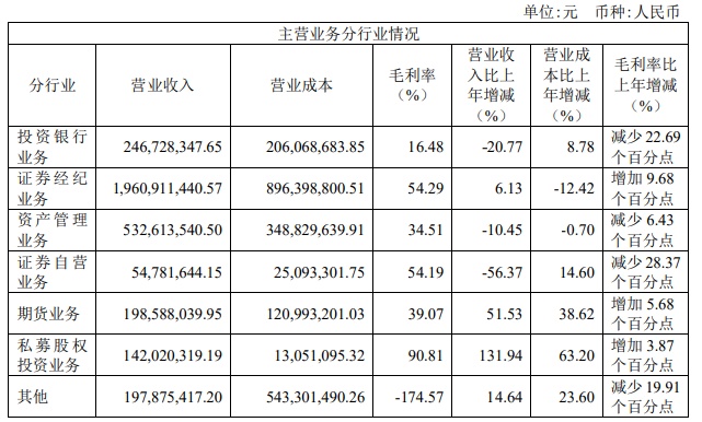 主营业务分行业来看,去年,中银证券投资银行业务实现营业收入2.47亿元,同比下降20.77%,毛利率为16.48%;证券经纪业务实现营业收入19.61亿元,同比增长6.13%,毛利率54.29%;资产管理业务实现营业收入5.33亿元,同比下降10.45%,毛利率34.51%;证券自营业务实现营业收入5478.16万元,同比减少56.37%,毛利率为54.19%;期货业务实现营业收入1.99亿元,同比增长51.53%,毛利率39.07%;私募股权投资业务实现营业收入1.42亿元,同比增长131.94%,毛利率为90.81%;其他业务实现营业收入1.98亿元,同比增长14.64%,毛利率为-174.57%。
