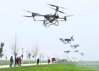 石家庄市栾城区恒丰种植专业合作社的麦田里,麦苗从地里冒出来一拃左右,十几台大型植保无人机和智能化农机正在对麦田进行水肥综合治理作业。