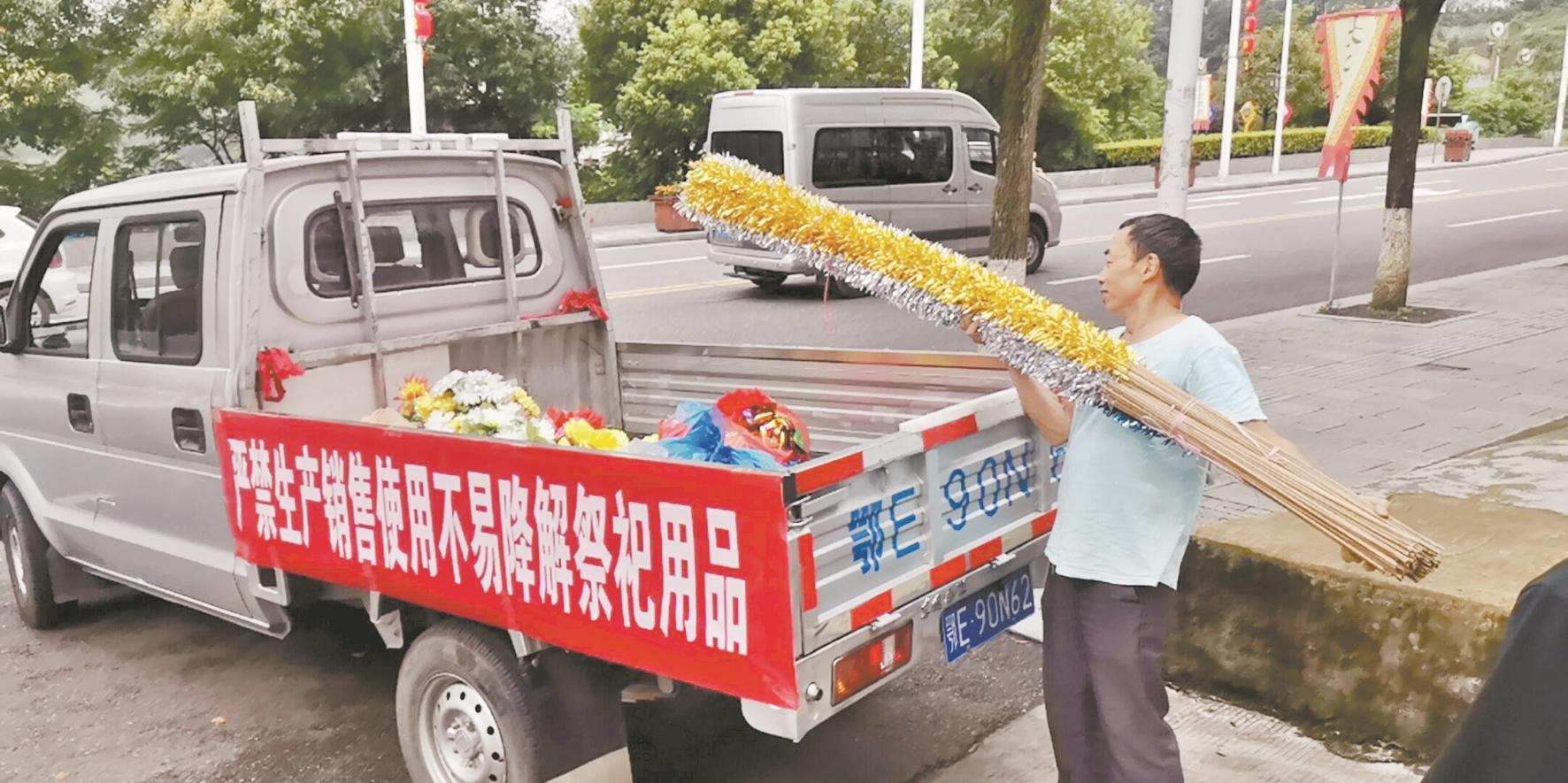 下大力气规范丧葬用品市场,是秭归县殡葬改革行之有效的手段。开展“双禁”行动,全面禁止生产、销售使用不易降解祭祀用品和超标准墓碑,对全县99家墓碑生产销售经营户进行整治,清理关停不符合整治要求的53家墓碑生产经营户,对46家通过整改要求的墓碑经营户重新办理营业执照,全县统一墓碑样式、规格及雕刻要求,严禁生产加工超标准的墓碑。