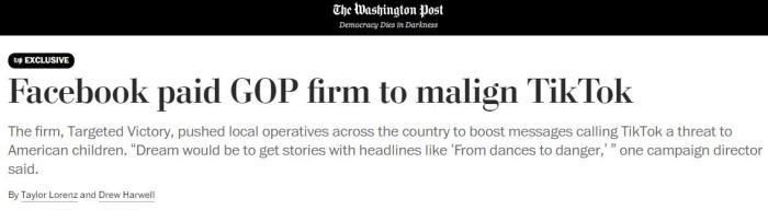 《华盛顿邮报》指出,Targeted Victory公司运用多种手段对TikTok进行打压,包括在美国各地主要新闻媒体发表专栏文章以及读者来信,宣传源自于Facebook的真实性存疑的文章,以及试图吸引政治记者和地方政客帮助打压其最大的竞争对手。
