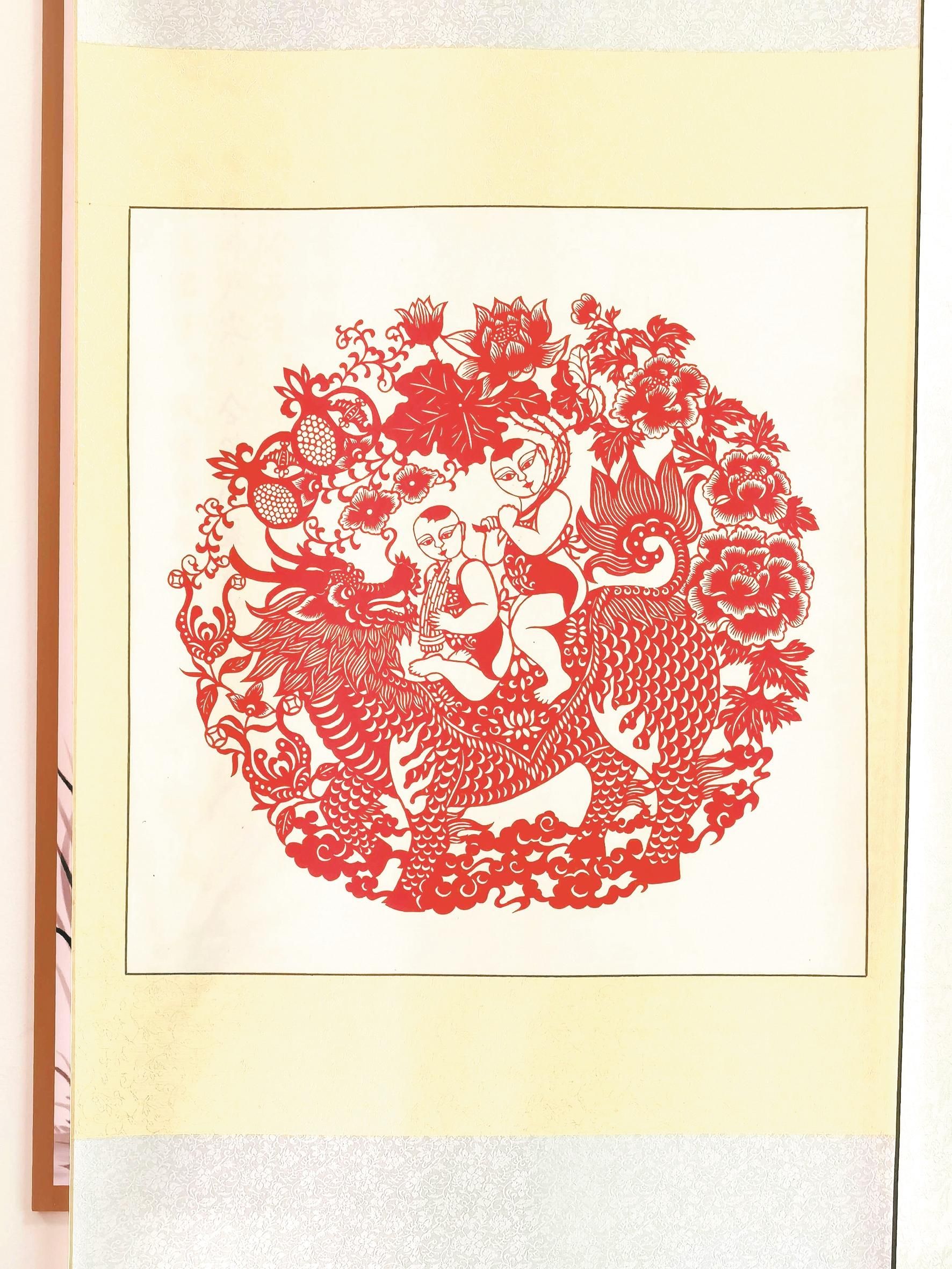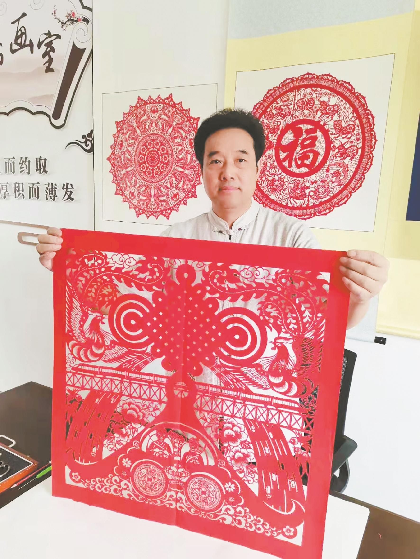 各式各样的文字、栩栩如生的十二生肖、活泼灵动的“福”字图案……在夏祖康的剪纸工作室内,一幅幅精美的剪纸作品琳琅满目、惟妙惟肖,让人看了赏心悦目。其中,作品《民族花开中华梦圆》,是夏祖康数十年来雕花剪纸生涯中牵头创作印象深刻的大幅系列剪纸,该作品高6米、宽10米,主题鲜明、气势恢宏。