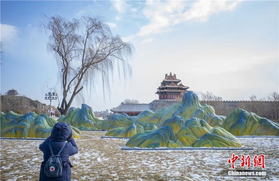 一位市民在北京故宫博物院西北角楼前欣赏“千里江山图”布景。中新社记者 侯宇 摄