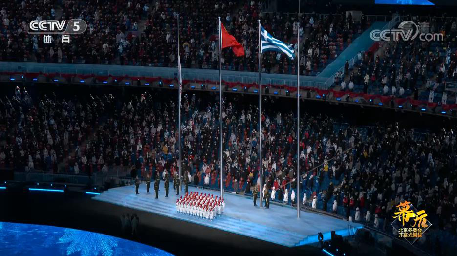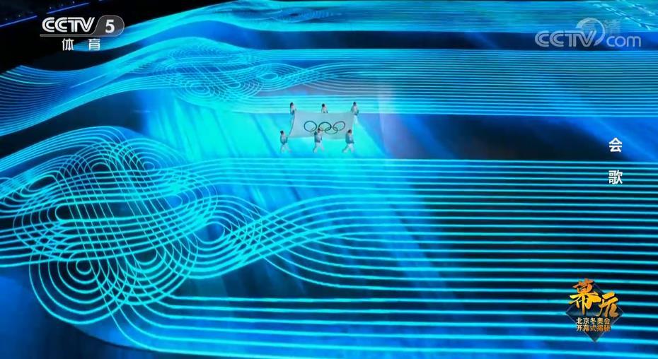 演唱奥林匹克会歌环节之前是会旗的入场仪式,最后一次彩排结束后,六名执旗手在场地内第一次对会旗入场环节进行排练。