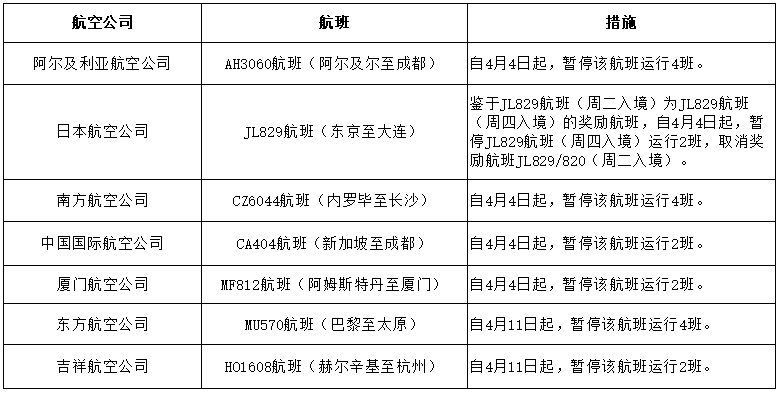 根据民航局通报,3月17日入境的航班中,阿尔及利亚航空公司AH3060航班(阿尔及尔至成都)确诊新冠肺炎旅客12例,自4月4日起,暂停该航班运行4班。日本航空公司JL829航班(东京至大连)确诊新冠肺炎旅客7例,鉴于JL829航班(周二入境)为JL829航班(周四入境)的奖励航班,自4月4日起,暂停JL829航班(周四入境)运行2班,取消奖励航班JL829/820(周二入境)。南方航空公司CZ6044航班(内罗毕至长沙)确诊新冠肺炎旅客12例,自4月4日起,暂停该航班运行4班。中国国际航空公司CA404航班(新加坡至成都)确诊新冠肺炎旅客8例,自4月4日起,暂停该航班运行2班。厦门航空公司MF812航班(阿姆斯特丹至厦门)确诊新冠肺炎旅客5例,自4月4日起,暂停该航班运行2班。