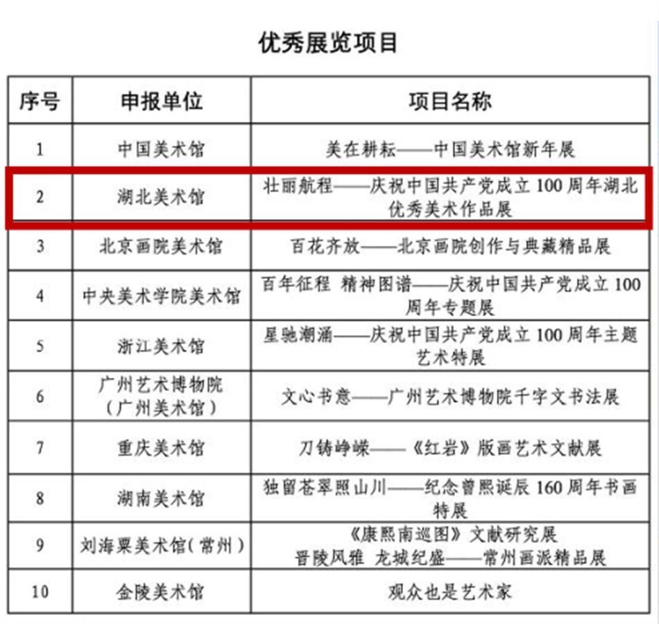 湖北日报讯(通讯员夏梓、符坚)近日,文化和旅游部艺术司公布《2020—2021年度全国美术馆优秀项目名单》,湖北美术馆申报的展览“壮丽航程——庆祝中国共产党成立100周年湖北优秀美术作品展”获评优秀展览项目(全国10个),“闻声而来·绘忆江城——湖北美术馆融媒体公共教育项目”获评优秀公共教育提名项目(全国优秀公教项目和优秀公教提名项目各10个)。