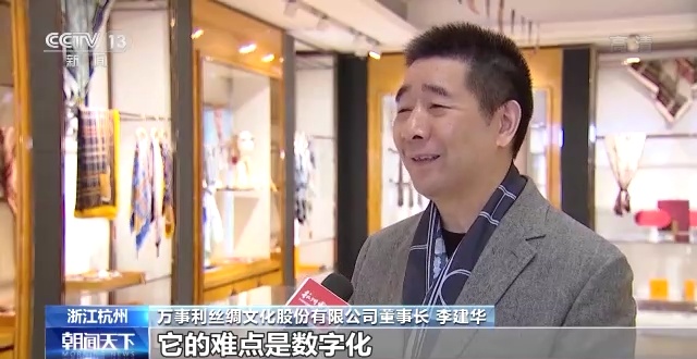万事利丝绸文化股份有限公司董事长 李建华:它的难点是数字化,就是说你要能够计算出每一块面料上需要多少个染色的分子、分子量、重量,这是前人一直没有做过的。