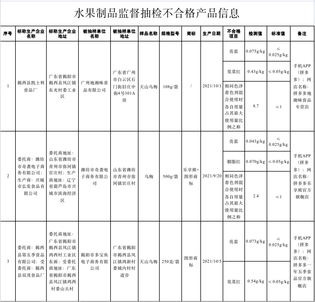 (二)拼多多地湘味食品专营店(经营者为广东省广州地湘味食品有限公司)在拼多多(手机APP)销售的、标称广东省揭阳市揭西县凯士利食品厂生产的天山乌梅,其中亮蓝、苋菜红、相同色泽着色剂混合使用时各自用量占其最大使用量比例之和等检测值不符合食品安全国家标准规定。