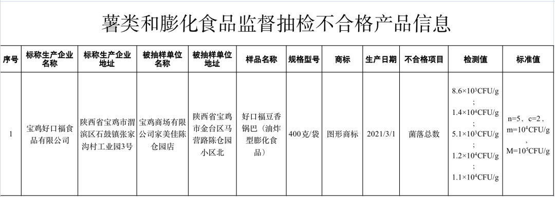 (六)陕西省宝鸡商场有限公司家美佳陈仓园店销售的、标称陕西省宝鸡好口福食品有限公司制造的好口福豆香锅巴(油炸型膨化食品),其中菌落总数不符合食品安全国家标准规定。