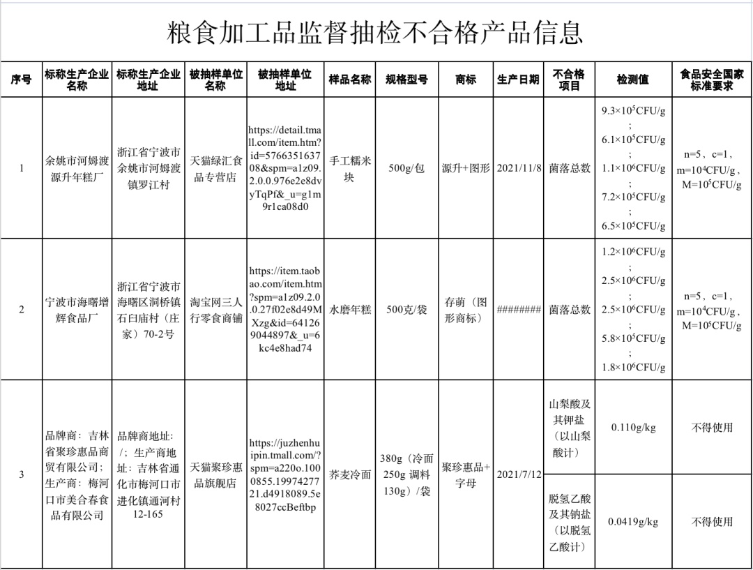 (四)天猫绿汇食品专营店(经营者为浙江省宁波市余姚市绿汇国际贸易有限公司)在天猫商城(网店)销售的、标称浙江省宁波市余姚市河姆渡源升年糕厂生产的手工糯米块,其中菌落总数不符合食品安全国家标准规定。