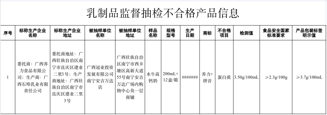 广西冠业投资发展有限公司南宁安吉万达店销售的、标称广西养力食品有限公司委托广西石埠乳业有限责任公司生产的水牛高钙奶,其中蛋白质含量符合食品安全国家标准规定,但不符合产品标签标示要求。广西石埠乳业有限责任公司对检验结果提出异议,并申请复检;经复检后,维持初检结论。
