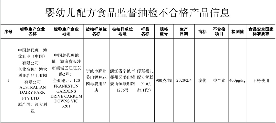 (一)浙江省宁波市鄞州姜山妈咪花园母婴用品店销售的、标称湖南省长沙市澳优乳业(中国)有限公司总代理的、澳大利亚乳品工业园有限公司AUSTRALIAN DAIRY PARK PTY LTD生产的淳璀婴儿配方奶粉(0—6月龄1段,原产国:澳大利亚),其中香兰素检测值不符合食品安全国家标准规定。湖南省长沙市澳优乳业(中国)有限公司对检验结果提出异议,并申请复检;经复检后,维持初检结论。长沙市望城区市场监管局已督促澳优乳业(中国)有限公司立即召回并封存不合格食品6726罐,没收违法所得2.03万元,罚款962.13万元。宁波市鄞州区市场监管局对销售不合格产品的宁波市鄞州姜山妈咪花园母婴用品店,没收违法所得和罚款共1.15万元。