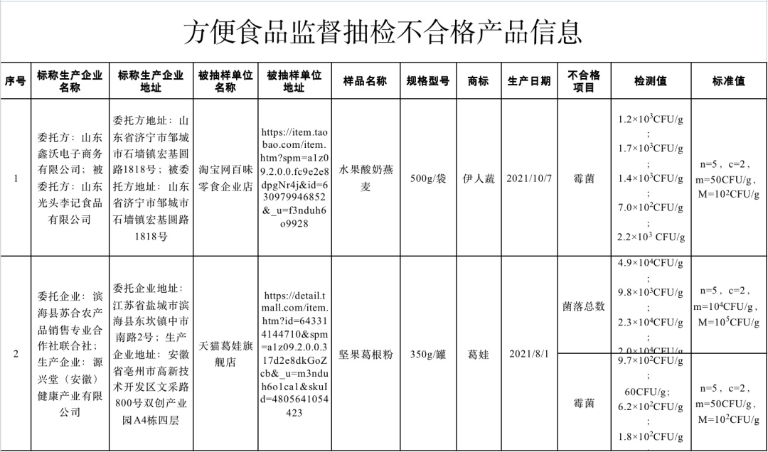 (一)淘宝网百味零食企业店(经营者为山东省济宁市邹城市百味电子商务有限公司)在淘宝网(网店)销售的、标称山东鑫沃电子商务有限公司委托山东光头李记食品有限公司生产的水果酸奶燕麦,其中霉菌数不符合食品安全国家标准规定。