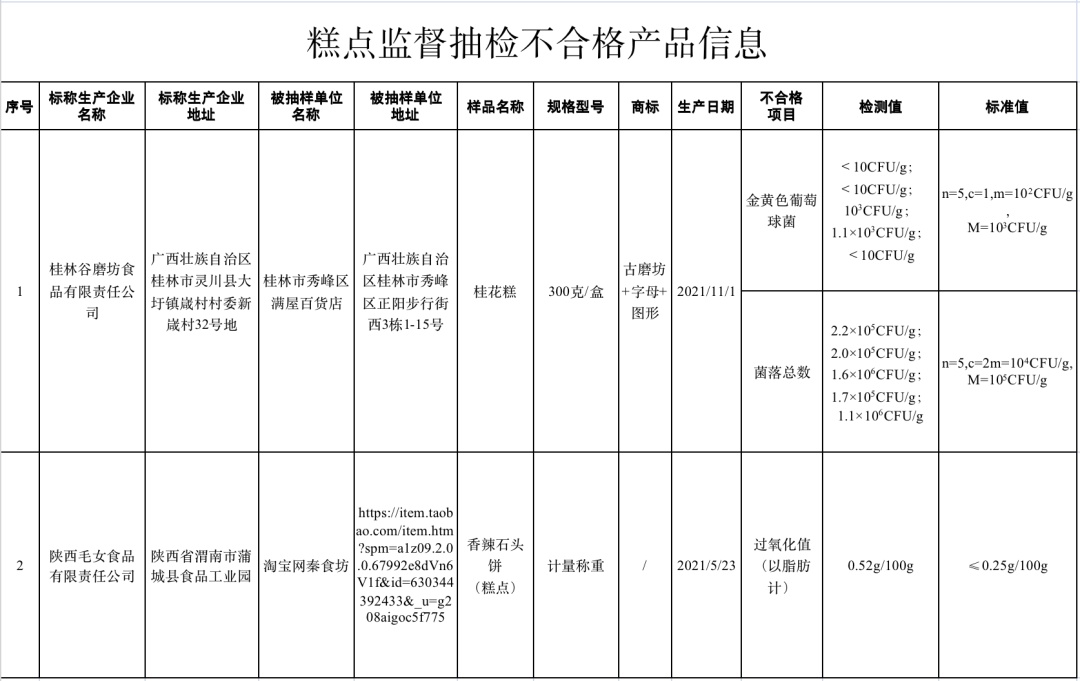 (三)广西壮族自治区桂林市秀峰区满屋百货店销售的、标称广西壮族自治区桂林谷磨坊食品有限责任公司生产的桂花糕,其中金黄色葡萄球菌数、菌落总数不符合食品安全国家标准规定。