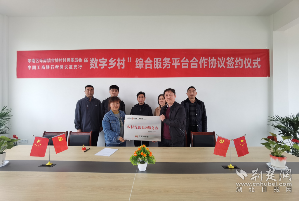 4月1日,工商银行孝感长征支行工作人员来到孝南区肖港镇金神村,在肖港镇党委书记熊雁、党委副书记李阳的见证下与村支部书记黄燕敏签订了“数字乡村”综合服务平台合作协议,并现场指导村委会成员和十多位村民下载工行“兴农通”系统。