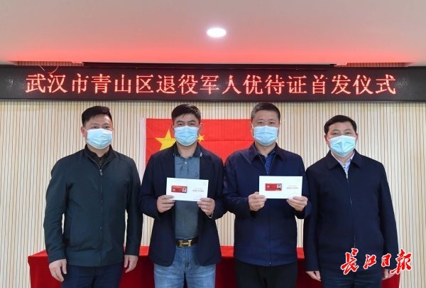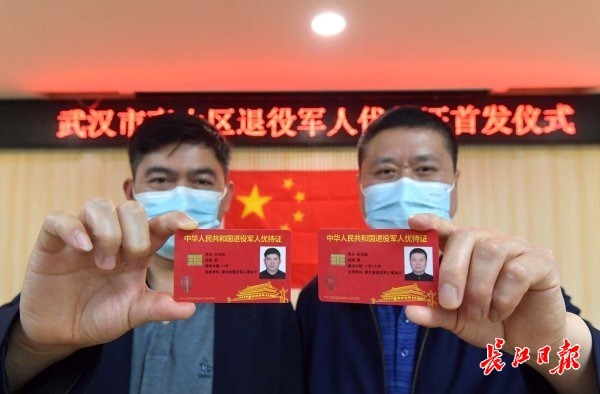 长江日报大武汉客户端4月6日讯(记者唐煜 丁静)4月6日下午,武汉市青山区红卫路街退役军人服务站,退役军人张茂益、佘鸿钦领到了全市首批退役军人优待证。这标志着武汉市退役军人、其他优抚对象优待证发放工作正式开始。