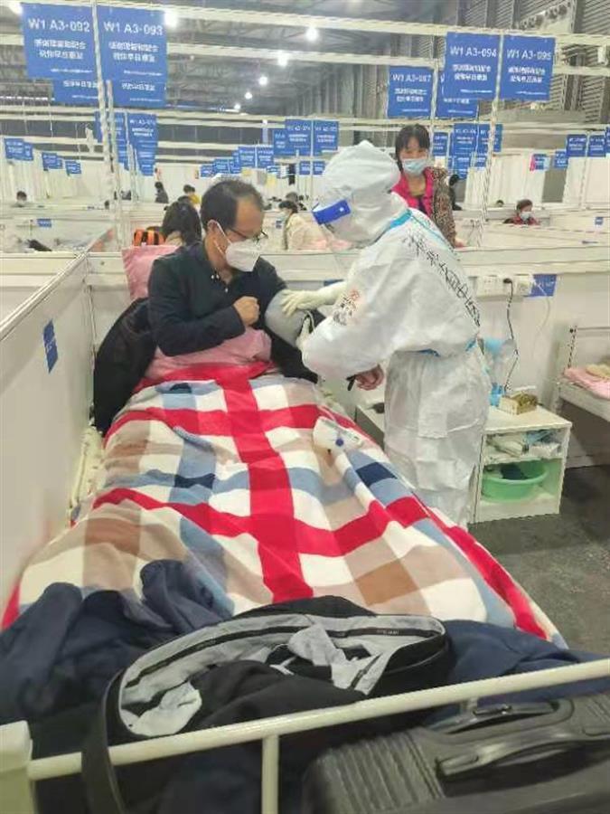 该院医疗队第一批进舱的队员是护士张寒、张雪娇、万好平,其中张寒和张雪娇均参与过2020年初支援武汉市金银潭医院的工作。在第一天的工作中,她们发挥特长,为有需要的患者进行了中医养生知识、康复锻炼方法的指导,并进行了穴位按摩等中医适宜技术的治疗。