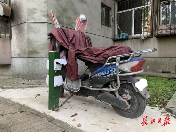 7日,长江日报记者在安居苑C区看到,一些居民楼下竖着几根充电桩,绿色的桩体约有80厘米高,每根桩体设有4个插座,插头的防水罩上标有房号,并且能用挂锁锁住。