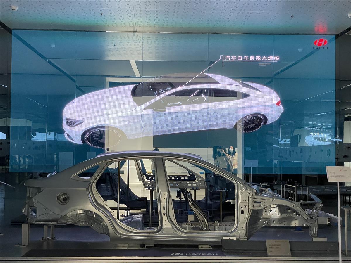 全白空间被分割成不同区域,错落有致,墙上的全球激光发展历史,随着游客的步入,由自动感应装置逐一点亮。从这里开始,便步入了由激光打造的充满无限可能的世界:小小的光斑不停“奔跑”,展示了激光的工作原理;手机、5G发射站、工业零配件、艺术品、汽车,这些展品以多样的方式告诉参观者,激光存在于生活的方方面面;而未来的激光技术会是什么样,在这里也能看到。