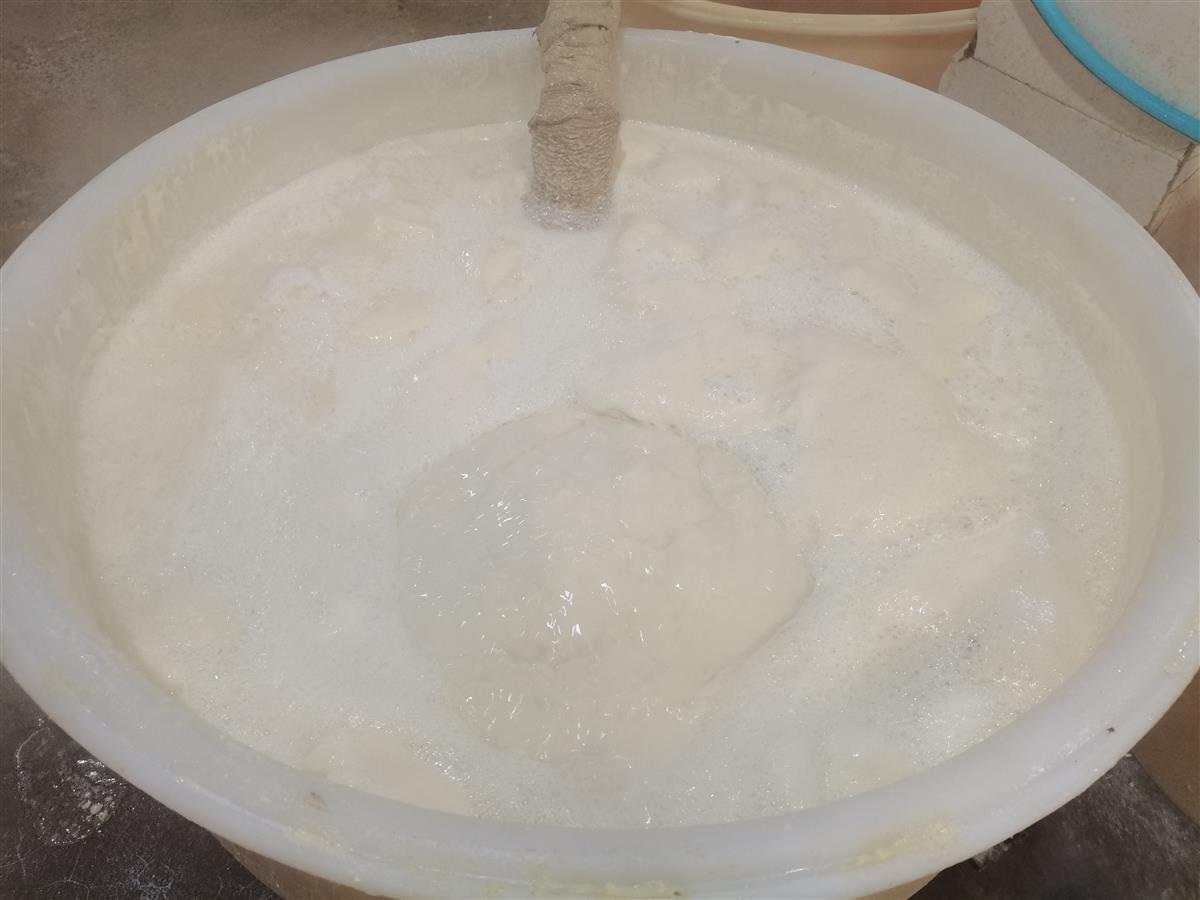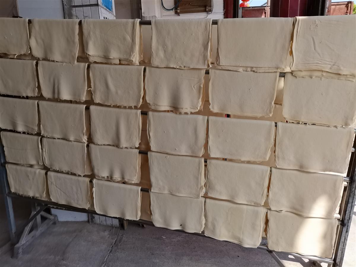 做皮子共包括挑黄豆、泡黄豆、磨浆、煮浆、点浆、压榨、摊冷等7个步骤,核心技术是点浆。程时华说,点浆关乎皮子的优劣,往往在电光石火的一瞬间点下去效果最佳,过早做出的皮子太嫩、易破、品相差;过迟则太老、裹水少、苦味大、口感差。