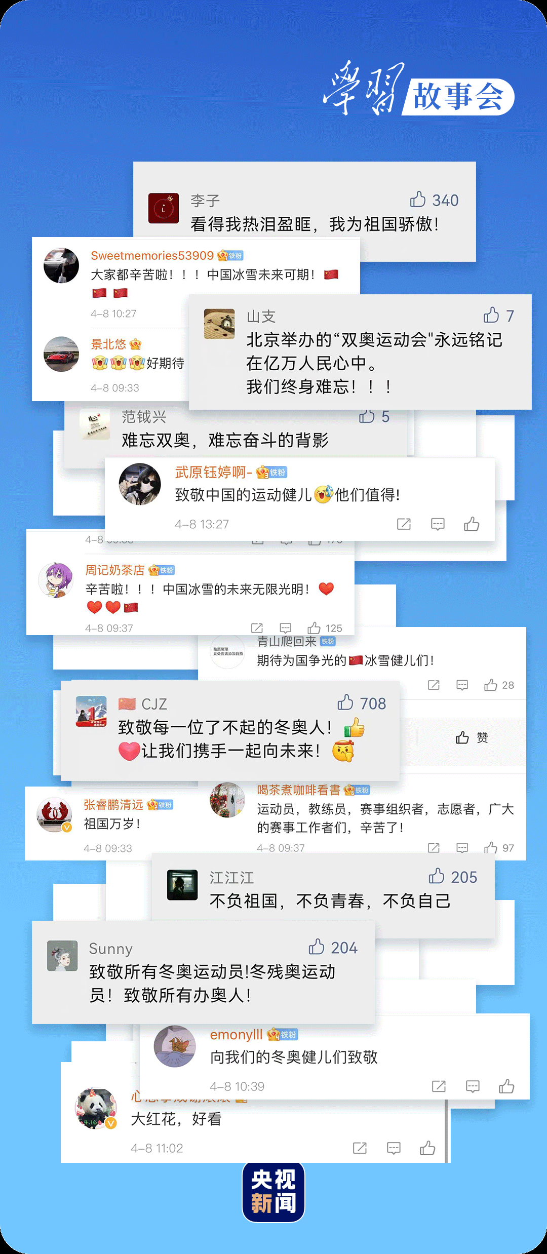 “同志们深情地表示:‘为了冬奥圆满成功,困难再多也嚼嚼咽了,一切付出与奉献都值得。’祖国和人民为你们的辛勤付出、取得的优异成绩感到自豪!”