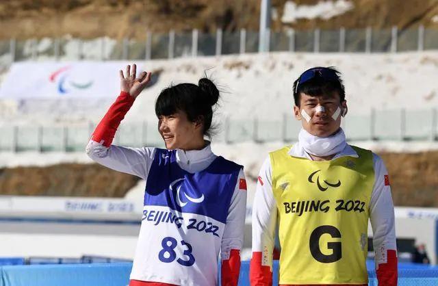 △3月8日,在残奥冬季两项女子中距离(视障)比赛后,王跃(左)向现场观众致意。