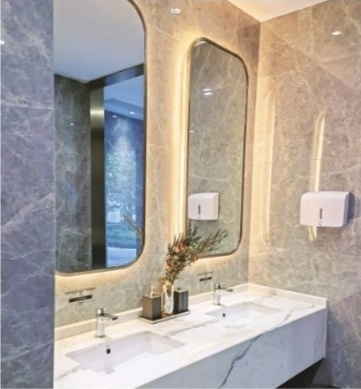 在绿城武汉黄浦湾A地块,小区公厕位于两栋楼的裙楼之间一楼。记者发现,小区公共厕所的面积大约30平方米,精装修处理。地面墙上贴了瓷砖,窗明几净,配有厕纸、洗手液和香薰机,还摆放了盆栽及吹风干手设备。