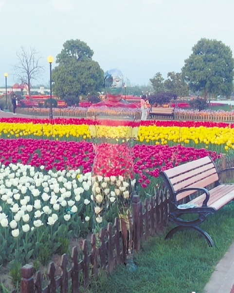 在王亮发布的短视频里,有许多是在花海里拍下的。花海有红、黄、绿、白等各种颜色,他将自己的身体绘成相应的颜色,在镜头里,几乎只能看到花,而很难注意到有人。