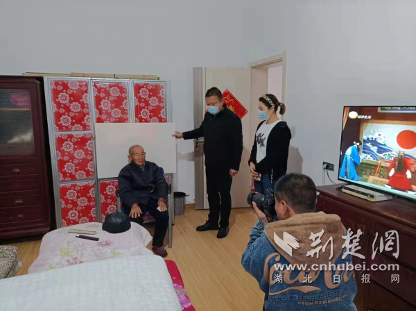 江夏区金水退役军人服务站为港尖大队90岁的退役老兵顾耀贤拍摄优待证证件照。 通讯员供图