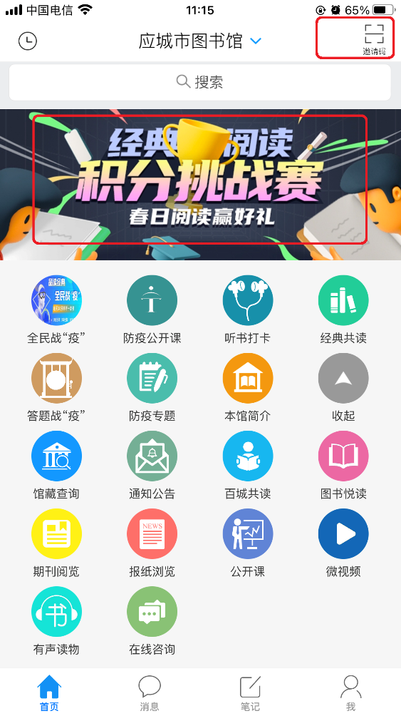 扫描上方二维码或在手机应用市场搜索“移动图书馆”下载安装APP
